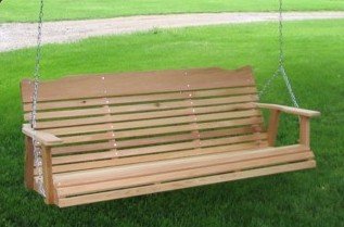 The Western Red Cedar Porch 5' Swing seats two comfortably, measuring approx. 23" high x 64" wide x 27" deep. This extra wide traditional natural wood swing comes with comfortable contoured seating, chain and springs. All the swing needs is a view. Our cedar furniture is shipped partially assembled, with easy to follow instructions. The 5' version has a 2nd set of seat crosses/back crosses - which further strengthens our already sturdy swing. The 5' version fits both larger folks and larger spaces on your porch. We also have available a 4' wide version. All of our patio furniture products are made from natural tight knotty Western Red Cedar with non-staining hardware. Western Red Cedar is lightweight, dimensionally stable, and naturally resistant to splitting, cupping, and warping. Western Red Cedar gives our patio furniture strength, beauty & natural resistance to the elements. **We are using Silicone Magic, with a cedar tint to enchance the finish. It is Ecologically safe, water based, clear drying, penetrating and highly flexible film. Extensive breathability, allowing air to escape from substrate. Silicon Magic has excellent water-repelling characteristics for long term protection. Additonal properties include excellent resistance to mildew, chemicals, and UV with exceptional additives for UV, mildew and insect protection. as well as color enhancement. As with any finish, the wood will darken a bit, but will bring out the red found in the cedar's grain.**