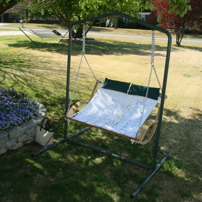 Sometimes, looks can be deceiving, but not in the case of our Curved-Arm Double Rope Swing. The beautiful two-person swing you see, with its bright-white lattice of polyester rope set against a steam-bent white-oak frame varnished to a honey-gold luster, is also the beautiful relaxation you get. Settle in with a special friend, and you'll be on a blissful trip to nowhere together in no time. As if the kiln-dried white-oak swing body wasn't lovely enough, add those curvy steam-bent outside armrests, and then hand-dip all that hearty Southern hardwood several times in high-gloss, honey-warm, marine-grade varnish. Now, set all of this against the brilliant white of the soft-spun polyester rope and the deep green of the swing pillows, and what have you got? Leisure elevated to the status of art. Needless to say, relaxation this pretty is going to attract plenty of attention. So be prepared to have to ask: Is it really me all my neighbors are here to see, or is it my Original Pawley's Island Curved-Arm Double Rope Swing? A tip for maximum enjoyment: Once you've hung your swing on your porch, or from a stand or favorite tree, and have given this highly crafted beauty an initial whirl or two, try adjusting the chain length to tilt the seat back further. Because the truth is, there's really no such thing as too much comfort. Pawley's Island SW-OP Original Polyester Rope Double Swing