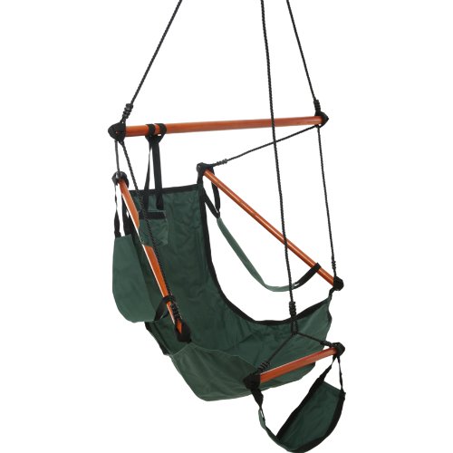 You need to try this chair to understand how comfortable it is. The Air Chair allows you to sit in the perfect position and offer a multi-point support system. With the footrest and the drink holder, you can rest assure that no one will want to leave it. The nylon fabric is durable and comfortable and does not stick to the skin or garments. The solid wood support bars enhance the warm look and provide durability and functionality. Affordable and most comfortable. Castaway Swing Chair, Green