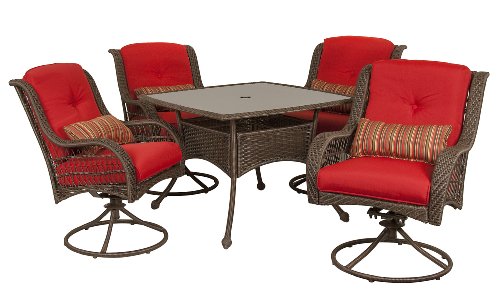 Bring La-Z-Boy Outdoor to your patio and experience the relaxing comfort and quality known to La-Z-Boy. The Bella Vista collection has classic style and bold garnet color putting the perfect accent on your outdoor space. The Bella Vista 5 Piece Dining Set is built to last, featuring a frame of hand-woven wicker over heavy duty, rust resistant aluminum and steel. The Swivel Dining Chairs have high backs with plush cushions and supportive seat cushions covered with the soft feel and durability of all weather outdoor Sunsharp® fabric. Sunsharp® is durable; stain, mildew and fade resistant; with anti-fading, bright, vibrant color. The stripe of the Lumbar Pillows blends butter, rust, the red of the cushions and the chocolate brown of the wicker. The dining table has brown marbled glass top with wicker edge and wicker pedestal stand. Complete your Bella Vista patio collection with the 3 Piece Bistro Set, 4 Piece Seating Set, or Bella Vista Umbrella and Stand. Stay cool and calm in your La-Z-Boy Outdoor Bella Vista 5 piece Dining Set.