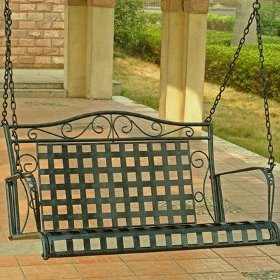 Enjoy a pleasant interlude with this iron porch swing. The piece features a grid seat and back, enhanced rust-proof design, antique black finish and delicate scrollwork throughout the frame. Chains included for hassle-free mounting. Optional cushion is available. In antique black finish. Made of iron. Uses EP protection for extended outdoor rust protection. Equipped with chains. Diamond lattice swing design. Option to add a custom made cushion for added comfort and style. 43 in. L x 21 in. D x 24 in. H Porch Swing in Black-Finished Wrought Iron