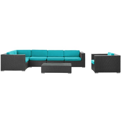Stages of sensitivity flow naturally with corona's robust seating experience. Find meaning among cliffs and caverns as you become the agent of influence in the espresso rattan base and all-weather beige fabric cushion repast. Open yourself to splendorous insights as you impart positivity among friends and family. Set includes: coffee table (1): 43-inch l by 24-inch w by 12-inch h armless section (2): 29-inch l by 35-inch w by 25-inch h armchair (1): 35-inch l by 35-inch w by 25-inch h left end section (1): 35-inch l by 35-inch w by 25-inch h right end section (1): 35-inch l by 35-inch w by 25-inch h corner section(1): 35-inch l by 35-inch w by 25-inch h set features: all weather synthetic rattan weave powder coated aluminum frame water and UV resistant machine washable cushion covers easy to clean tempered glass top ships pre-Assembled LexMod Corona 7-Piece Outdoor Rattan, Espresso with Turquoise Cushion