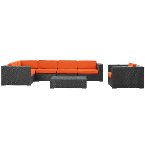 Stages of sensitivity flow naturally with corona's robust seating experience. Find meaning among cliffs and caverns as you become the agent of influence in the espresso rattan base and all-weather beige fabric cushion repast. Open yourself to splendorous insights as you impart positivity among friends and family. Set includes: coffee table (1): 43-inch l by 24-inch w by 12-inch h armless section (2): 29-inch l by 35-inch w by 25-inch h armchair (1): 35-inch l by 35-inch w by 25-inch h left end section (1): 35-inch l by 35-inch w by 25-inch h right end section (1): 35-inch l by 35-inch w by 25-inch h corner section(1): 35-inch l by 35-inch w by 25-inch h set features: all weather synthetic rattan weave powder coated aluminum frame water and UV resistant machine washable cushion covers easy to clean tempered glass top ships pre-Assembled LexMod Corona 7-Piece Outdoor Rattan, Espresso with Orange Cushion