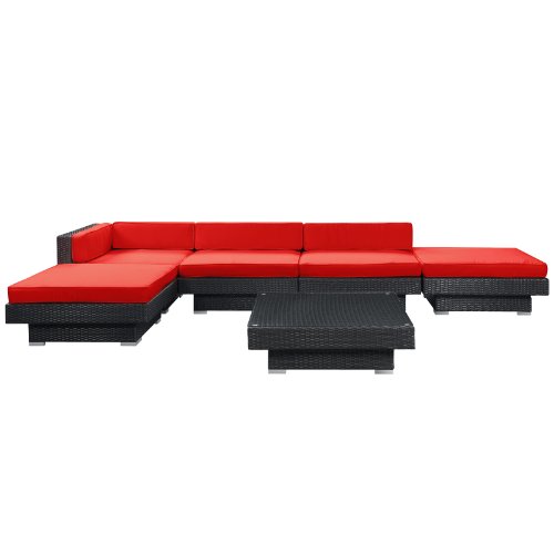 Plumb the surface depths with the sweetly expressive laguna corner set. Encompass moments of inspiration as you create ripple effects to be felt the world over. With soft all-weather light blue fabric cushions and espresso rattan base, yield surprising results and let spontaneity flow forth as you sit in lavish comfort. Set includes: coffee table (1): 35-inch l by 35-inch w by 11-inch h ottoman (2): 35-inch l by 35-inch w by 11-inch h corner section (1): 35-inch l by 35-inch w by 24-inch h armless section (2): 35-inch l by 35-inch w by 24-inch h set features: all weather synthetic rattan weave powder coated aluminum frame water and UV resistant machine washable cushion covers easy to clean tempered glass top ships pre-Assembled LexMod Laguna Outdoor Wicker Patio 6 Piece Sectional Sofa Set In Espresso with Red Cushions