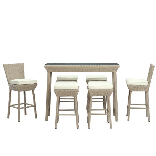 Return home to fresh brewed ale and vintage wines with a patio set brimming with piquancy. Create your own ambient café as you welcome in ultimate aspirations and momentary encounters. Contemporary rattan stools, powder coated aluminum frames and all-weather white cushions outfit a décor made for thoughtful discussions. Set includes: table (1): 51-inch l by 18-inch w by 39-inch h bar stool (2): 18-inch l by 16-inch w by 39-inch h stool (four): 16-inch l by 16-inch w by 26-inch h set features: all weather synthetic rattan weave powder coated aluminum frame water and UV resistant machine washable cushion covers easy to clean tempered glass top LexMod Napa Outdoor Wicker Patio Pub Table and Stools 7 Piece Set in Oatmeal with White Cushions