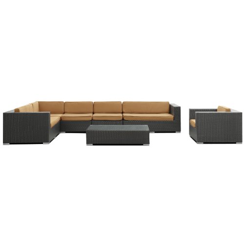 Outfit your patio with an imaginative centerpiece that exceeds expectations. Finely constructed espresso rattan seating sectionals with all-weather light blue fabric cushions make the imaginative a reality in palpable distinction. From subterranean springs to desert terrains, enter a relationship of continuously elevated states and manifest freedom. Set includes: armchair (1): 35-inch l by 38-inch w by 25-inch h coffee table (1): 49-inch l by 30-inch w by 12-inch h left arm section (1): 55-inch l by 35-inch w by 25-inch h armless section (2): 35-inch l by 35-inch w by 25-inch h corner section (1): 35-inch l by 35-inch w by 25-inch h right arm section (1): 55-inch l by 35-inch w by 25-inch h set features: all weather synthetic rattan weave powder coated aluminum frame water and UV resistant machine washable cushion covers easy to clean tempered glass top ships pre-Assembled LexMod Palm Springs 7-Piece Outdoor Rattan, Espresso with Mocha Cushions