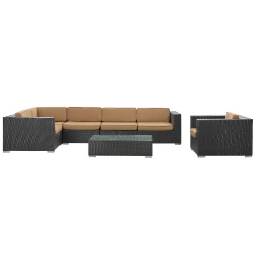 Stages of sensitivity flow naturally with corona's robust seating experience. Find meaning among cliffs and caverns as you become the agent of influence in the espresso rattan base and all-weather beige fabric cushion repast. Open yourself to splendorous insights as you impart positivity among friends and family. Set includes: coffee table (1): 43-inch l by 24-inch w by 12-inch h armless section (2): 29-inch l by 35-inch w by 25-inch h armchair (1): 35-inch l by 35-inch w by 25-inch h left end section (1): 35-inch l by 35-inch w by 25-inch h right end section (1): 35-inch l by 35-inch w by 25-inch h corner section(1): 35-inch l by 35-inch w by 25-inch h set features: all weather synthetic rattan weave powder coated aluminum frame water and UV resistant machine washable cushion covers easy to clean tempered glass top ships pre-Assembled LexMod Corona 7-Piece Outdoor Rattan, Espresso with Mocha Cushion
