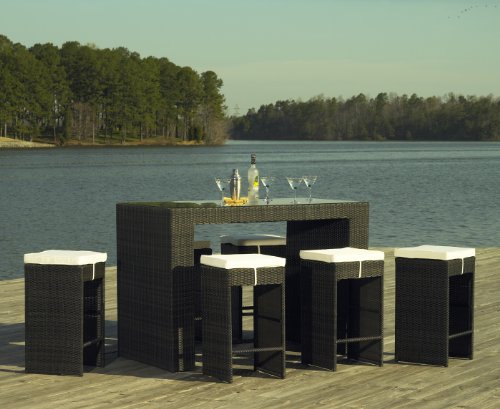 Outdoor entertaining of family and friends is a breeze with our beautiful contemporary outdoor wicker bar set that will give you a simple yet casual bar/dining experience for you and your guests. South Hampton Outdoor Wicker Bar Set: -Customize your outdoor area with a choice of either a light taupe wicker or the rich walnut wicker. -Constructed of poly-ethylene outdoor wicker on a powder-coated aluminum frame. -This set is compact and all wicker barstools can be placed under the table for easy storage! -Six Barstools included with cushions with ties for maximum comfort! Order Now! This outdoor wicker bar stool set is in stock!b> Outdoor Wicker Bar Set