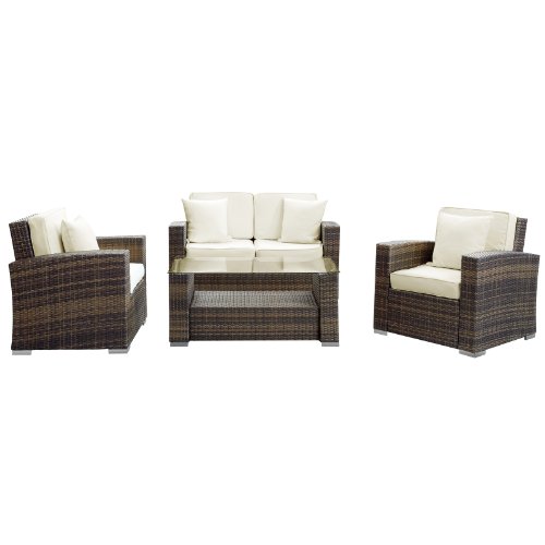Suffuse yourself with a creative force that embodies powerful restorative potentials. The newport daybed set is a clean and expansive piece that complements your free passage to complementarity. Develop a tangible connection as you involve yourself with conversations inspired by the medium they are communicated upon. Set includes: coffee table (1): 30-inch l by 35-inch w by 12-inch h ottoman (2): 30-inch l by 30-inch w by 12-inch h chaise lounge (2): 30-inch l by 35-inch w by 25-inch h set features: all weather synthetic rattan weave powder coated aluminum frame water and UV resistant machine washable cushion covers easy to clean tempered glass top LexMod Carmel Outdoor Wicker Patio 4 Piece Sofa Set in Brown with White Pillows